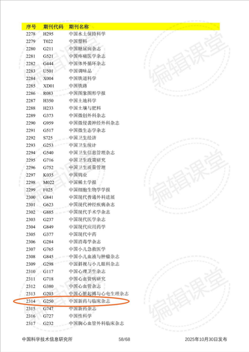 此次统计报告于2025年10月30日正式发布,标志着新一轮中国科技论文统计工作的完成。《中国新药与临床杂志》凭借持续的学术影响力与高质量的办刊水平,持续榜上有名!